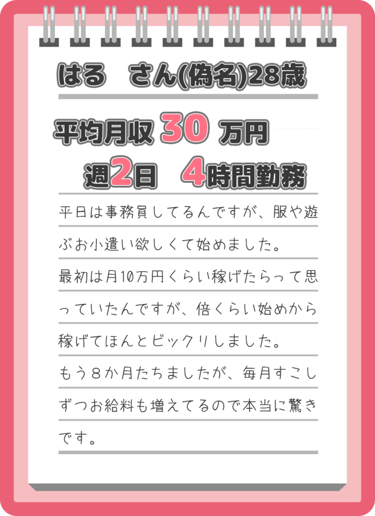 応募要項 年齢18歳以上の女性の方(高校生不可)勤務地自宅・通い(新潟駅前・新潟西区)勤務時間お好きな時間に働けます。一日1時間~隙間勤務OK必要書類写真付き身分証明書(運転免許・パスポート・学生証・マイナンバー・住基カードなど)応募方法電話(025-383-6066)応募フォーム・LINEよりお願いしたします。 氏名 メールアドレス 電話番号 メッセージ本文 (任意) 姉妹店